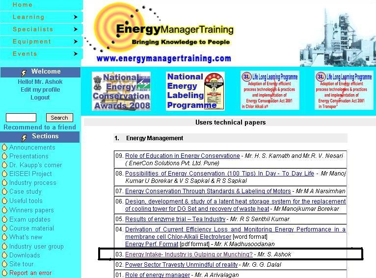 Open the Home page of www.energymanagertraining.com site. You will find in the top left quadrant of the home page LEARNING Hyper link. If you click the same, the Drop down box appears and you click the title USER TECHNICAL PAPERS.